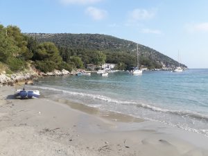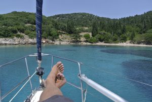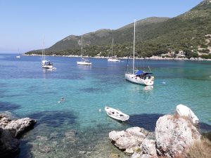 Sobald man den inneren Bereich der Ionischen Inseln verlässt, ist schlagartig weniger los. Dafür sind die Wellen etwas mehr zu spüren, was uns zu Beginn einen flauen Magen verschaffte. Die Atheras Bay ist eine wunderschöne große Badebucht mit ein paar kleinen Fischerbooten und zwei Tavernen. Am Abend kehrt dort totale Ruhe ein. Außer uns lagen noch drei weitere Segler vor Anker, die ebenso wie wir im leichten Schwell schaukelten.