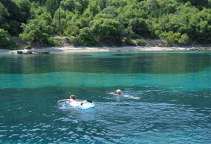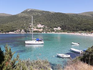 Bei unserem zweiten Stopp, lagen wir in der Polis Bay im Nordwesten von Ithaka vor Anker. Es war genügend Platz vorhanden und alles schien bestens bis dann der Wind auffrischte. Es war NW bis 20 KT prognostiziert, was an und für sich nicht so stark wäre. Leider drehte der Wind in dieser von Hügeln eingerahmten Bucht immer wieder und kam letztendlich aus allen Richtungen. Mein Anker war aber so eingefahren, dass er eben die NW-Richtung abdeckte. Als wir gerade wieder mal genau gegenüber (SO-Richtung) lagen kam eine etwas stärkere Böe und drückte so an, dass der Anker ausgebrochen wurde, zu slippen begann und wir Richtung Badebereich-Absperrbojen drifteten. Wieder was dazu gelernt…. ich hätte es nicht für möglich gehalten, denn beim Schnorcheln konnte ich vom Anker nichts mehr sehen, so tief war er im Sand. Wenn man am Schiff ist – kein Problem, was aber wenn nicht… Meine Damen mussten jedenfalls alleine nach Stavros rauf gehen. Bis Mitternacht wurden die Böen weniger und nächsten Tag setzten wir unsere Fahrt nach Sami fort.