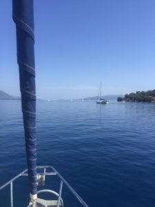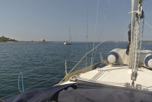 In Sami hatten wir beim Ablegen einen „Ankersalat“ – mein Anker lag unter zwei 10mm Ketten von Seglern auf der anderen Hafenseite. Dieses Gewicht war so schwer, dass die Winsch der Calisto die „gegnerischen“ Ketten nicht zur Gänze hochheben konnte. Einer der Jungs musste also ins Wasser und eine Leine unter den Ketten durchziehen, damit ich diese an der Klampe fixieren konnte. Danach konnte mein Anker etwas gesenkt werden und wurde von unserem Taucher zwischen den beiden Ketten herausgewurschtelt. Nachdem mein Anker frei war konnte das Seil wieder gelöst werden und die beiden Ankerketten sanken auf den Boden. Bei knapp 30 Grad Wassertemperatur kein Problem, in einem kühleren Gewässer nicht so toll…
