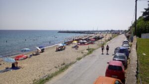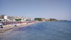 Wie geplant lag die Calisto genau ein Monat in der Marina Thessaloniki (285€). Ich kam an einem Freitag spät Abend retour und startete bereits am nächsten Vormittag bei herrlichem Wetter meinen Törn nach Lesbos. Das Boot war unversehrt, der Tank noch ziemlich voll. Ich benötigte nur ein paar Lebensmittel und freute mich auf den kommenden Trip. Zuerst wieder nach Kallikratia, wo ich im Hafen abermals locker Platz fand. Es war zwar bereits etwas mehr los, aber ein paar Schiffe hätten schon noch Platz gehabt. Im Ort gab es emsiges Treiben und am langen Badestrand tummelten sich die Badetouristen.