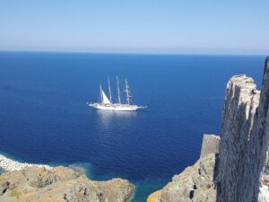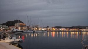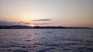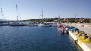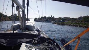 Am nächsten Tag hatte ich bei Chalkidiki/Kassandra wieder den Kanal von Potidea mit der Brücke zum Durchfahren, aber diesmal war ich bereits entspannt denn ich wusste ja, dass alles passt. Danach folgten noch 30NM bis Porto Koufos. Es kamen ein paar Delphine vorbei, ansonsten nur ein Segler in der Ferne. Ich erreichte Porto Koufos in der Nachmittagssonne und konnte am selben Platz wie die Wochen zuvor längsseits anlegen. Tanken, Spaziergang, Abendessen bei Pefkos, einen Drink als Absacker und ab in die Koje.
