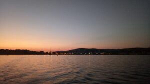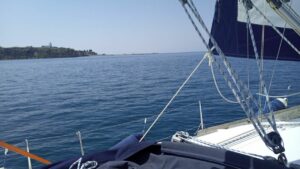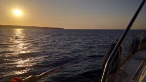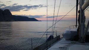 Die kommende Nacht schlief ich etwas unruhig denn es standen knappe 60NM bis Lesbos auf dem Programm. Ich startete bereits im ersten Dämmerungslicht den Motor und fuhr in der mit rot/grün befeuerten Fahrrinne hinaus in die weite Bucht. Danach hieß es Segel hoch und sobald ich aus dem Kolpos Moudros draußen war stellte ich den Motor ab.