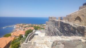 Nun konnte ich mich etwas umsehen und bereits der erste Erkundungsspaziergang war äußerst positiv. Wieder ein absolutes Highlight in Griechenland. Da es mir hier so gut gefiel verbrachte ich insgesamt vier angenehme Tage. Zudem hatte ich ab dem zweiten Tag Isa und Markus (ein nettes Bayerisches Pärchen mit ihrer Najad TARA) als Nachbarn mit denen es sehr kurzweilig zum Plaudern war. Im Laufe der Tage füllte sich der gesamte Kai in lockerer Anlegeweise. Die große Bucht wäre auch zum Ankern geeignet und war trotz immer wieder aufbriesendem Wind eigentlich stetig ruhig. Für mich waren das richtige Urlaubstage die ich mit kleinen Erkundungen der Gegend, diversen Lokalbesuchen, etc. ausfüllte. Die Ortschaft Mithymna (auch Molivos) liegt äußerst ansehnlich am Fuß der Burg und ist ein Magnet für Touristen der ganzen Insel. Kleine, enge, schattige Gassen mit Kopfsteinpflaster, gespickt mit diversen Geschäften aber auch verschiedenste Lokale mit Aussichtsterrassen prägen das Bild dieser Wohlfühloase. Die darunter liegende Bucht hat einen ewig langen Kiesstrand, wo im Nahbereich des Dorfes ein paar Strandbars und kleinere Hotels zu finden sind.