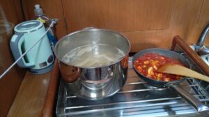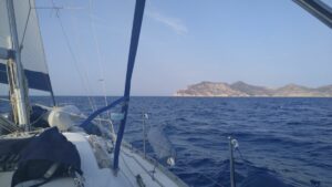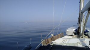 Es kam meine bisher ruhigste Fahrt. Praktisch kein Wind, keine Wellen, permanenter Sonnenschein mit angenehmen Temperaturen – ein richtige Erholungstour, allerdings mit Motor. Ich habe es aber trotzdem genossen und mittags sogar gekocht (Spaghetti von vorgestern aufgewärmt 😉) Nach knappen 10 Stunden Fahrt kam ich bei der Insel Salamina in der Bucht Peristeria an. Diese Gegend kannte ich nicht. In der Navily-App wird dieser Platz gut beschrieben und es war auch tatsächlich so, die angekündigte Gyrosbude gab es allerdings nicht mehr. Man ankert hinter einer vorgelagerten kleinen Felsinsel und liegt sehr geschützt. Es war Freitag und somit gab es keine Charterboote, dementsprechend fand ich leicht Platz. Allerdings kamen bis in die Nacht hinein noch Wochenend-Yachten aus dem nahen Athen.