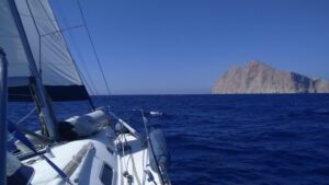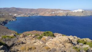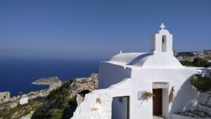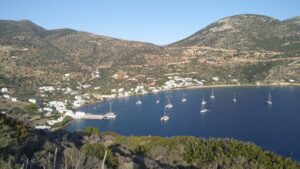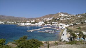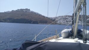 Am dritten Morgen war es etwas ruhiger. Ich ging noch zum Bäcker und startete kurz danach meine Überfahrt zur Insel Anafi. Auch dieser Törn wurde abermals ziemlich wellig mit beständigem Segelwind und Böen bis gut 20Kn. Im kleinen, neu ausgebauten Hafen von Anafi konnte ich längsseits anlegen.