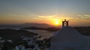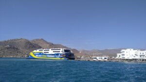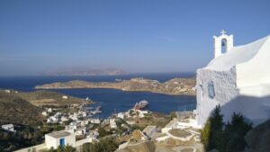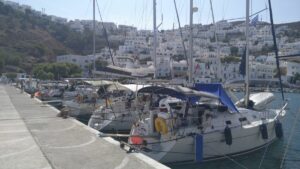 Sobald der kommende Morgen graute, startete ich und fuhr weiter nach Norden zur Insel Ios. Diese Etappe war zwar nicht so lange, doch Gegenwind bis 22Kn und Wellen machten es zu einer ruppigen Motorfahrt. Im Hafen Ios war am Ostkai noch Platz für mich. Entgegen der Beschreibungen gab es aber keine Mooringleine und ich musste meinen Anker nehmen.