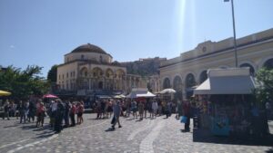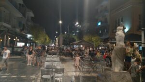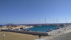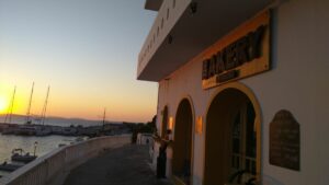 Bei der Kanalausfahrt zeigte sich der Golf von Korinth spiegelglatt, kein Windhauch und sehr warm. Ich fuhr das kurze Stück rüber zur „Marina“ Korinth, die sich seit dem Vorjahr nicht verändert hatte. Ich konnte sogar meinen Stammplatz (längsseits am t-förmigen Schwimmsteg) nehmen. Es war Samstag, also Markttag in Korinth, weshalb ich noch schnell in die Innenstadt ging, um meine Obst- und Gemüsevorräte günstig aufzufüllen. Kurz darauf marschierte ich bereits mit prall gefüllten Taschen retour. In der Fußgängerzone drängten sich schon am Nachmittag die Menschen und auch am Abend ging es dort mächtig zu. Die Lokale gut besucht, überall Musik, spielende Kinder und freudige Gesichter – authentisches Griechenland!