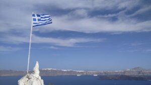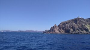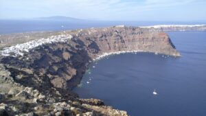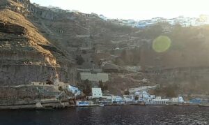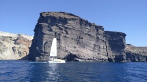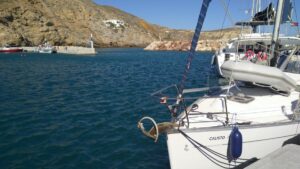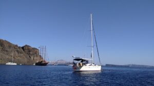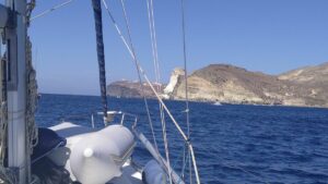 Bereits vor der Einfahrt in die Kaldera (Santorin ist ja eine Vulkaninsel) wurde die Südküste spektakulär und jede Menge an Touristenbooten fuhren entlang der senkrechten dunklen Vulkanfelsen. Danach einer der Höhepunkte vom Segeln in Griechenland. Auf eigenem Kiel in den inneren Bereich (also der ehemalige Vulkankrater) einfahren – sehr beeindruckend. 5NM später gelangte ich zu meinem Ziel, der westlich gelegenen Insel Thirasia, wo ich in der Bucht Ormos Nikolaos eine Boje reserviert hatte. Diesen Tipp hatte ich von meinem Seglerkollegen Christian bekommen, denn Ankern ist im inneren Bereich von Santorin praktisch nicht möglich und anlegen kann man als Privatschiff auch nirgends. Die Manolas Bojen (siehe NAVILY App) werden mit WhatsApp reserviert und kosten 50€ pro Nacht. Für griechische Verhältnisse ziemlich teuer, aber eindeutig eine gute Investition.