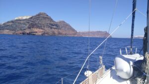 Die Nacht war ruhig und mein Katamarannachbar lief bereits im Morgengrauen aus. Ich wartete noch etwas und startete nach dem zweiten Kaffee Richtung Santorin. Eigentlich war weniger Wind prognostiziert, aber 15-20Kn blasen hier anscheinend immer. Und so gab`s abermals eine beschwingte Segelfahrt bis in die Windabdeckung von Santorin.