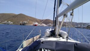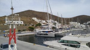 Nach einer sehr ruhigen Nacht startete ich bereits im Morgengrauen und legte meinen Kurs Richtung NNW Kythnos. Knappe 40NM wo ich mir eine reine Motorfahrt erwartete. Zwischen den Inseln (Serifos ließ ich östlich liegen) gab es Nordostwind und so konnte ich auch ein paar Stunden hart am Wind ohne Welle segeln. Mein Ziel war der Hafen Merichas auf der Westseite von Kythnos, welcher bei meiner Ankunft gegen 15.00 Uhr bereits ziemlich voll war. Ich erhielt den letzten Platz neben einem 45ft Charterkatamaran mit sehr freundlichen Saudi Arabischen Gästen (Skipper und Koch waren weiblich).