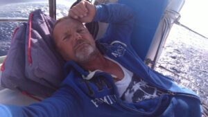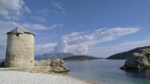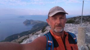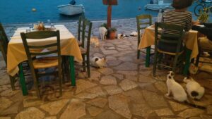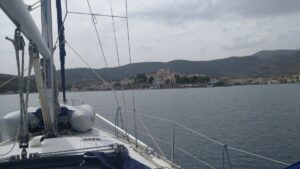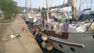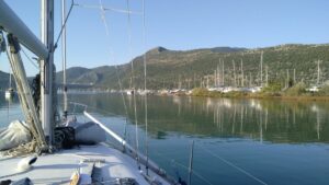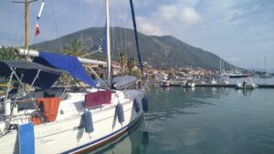 Am kommenden Morgen war alles wolkenverhangen, es tröpfelte leicht. Ich startete dennoch zeitig zu meiner letzten längeren Etappe Richtung Kalamos. Das Ionische Meer hatte mich wieder, es kam irgendwie das Gefühl auf nach Hause zu kommen. Ich segelte hart am Wind mit Motorunterstützung bis Oxia. Von dort gings vorerst mit kräftigem Gegenwind nordwärts. Nach einer Stunde wurde es ruhiger und nach weiteren zwei Stunden konnte ich im Hafen von Kalamos bereits anlegen (r.k., Buganker). George dirigierte wie eh und je die ankommenden Segler auf die Plätze, half beim Anlegen, sah aber bereits etwas müde aus. Kein Wunder, denn er macht diesen Job täglich seit Anfang Mai, wobei er die Skipper(innen) immer mit seinen legendären Worten „excellent Captain“, „you are perfect“, „wonderful“ (egal ob das Anlegemanöver gut oder schlecht ist 😉) begrüßt.