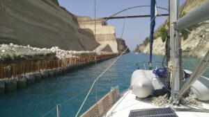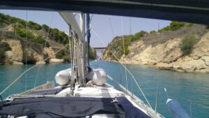 Die Nacht war windstill und total ruhig. Da ich genug Zeit hatte nahm ich mal wieder meine Laufschuhe und drehte eine kleine Erkundungsrunde am Ufer. Hier gibt es wirklich nur griechische Wochenendhäuser und keinen klassischen Tourismus. Dementsprechend ist auch die Infrastruktur sehr mager. Im näheren Umfeld gab es keine Taverne. Auf der windstillen Weiterfahrt nach Korinth zeichnete sich schon das Saisonende ab. Vor der Einfahrt zum Kanal von Korinth waren wir nur zwei Segler und eine große Motoryacht. Meine 7. Kanaldurchfahrt (157€) stand vor mir und ich genoss es so wie immer.