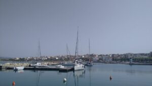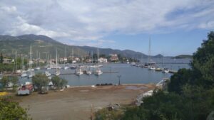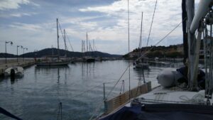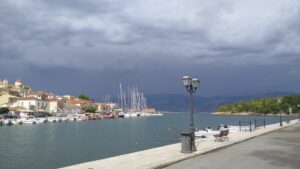 Hier hatte ich in der Marina bereits einen Platz reserviert (25,5€/N) und spazierte kurz später bereits in die 2km entfernte griechische Kleinstadt. In der Hafenbucht lagen etwa 15 Segler vor Anker und am Kai hatten sich ebenfalls mehrere längsseits verheftet. Eigentlich war noch sehr viel los. Die Innenstadt zeigte sich am späten Nachmittag ziemlich leer, hier werden die Gassen erst am Abend etwas belebter sein. Da befand ich mich jedoch schon wieder in der Marina und verspeiste im dortigen Restaurant einen gegrillten Lagunenfisch. Währenddessen zogen immer Gewitter vorbei, wir wurden jedoch verschont.