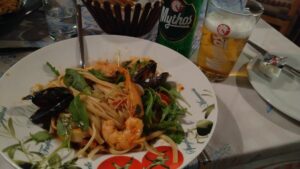 Für die kommenden Tage stand stärkerer Meltemi in Aussicht, weshalb ich mich gut einrichtete. Zusätzlich gab es hier jedes mal ziemlich Schwell wenn eine der zahlreichen Fähren am äußeren Hafen anlegte. Mein Anker hielt, der Abstand zum Kai passte auch, alles paletti.