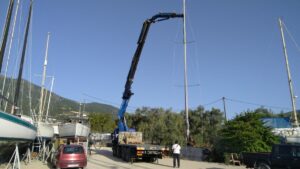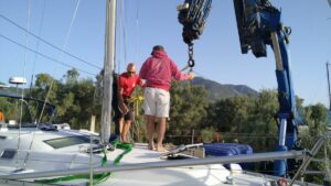 Danach wurde die Calisto beim nahen Konidaris Boat Yard wieder an Land gebracht, wo sie bis ca Ende April 2024 aufgebockt im Trockenen steht. Das größte Winterprojekt ist diesmal die Erneuerung des gesamten Riggs (jene Seile, die den Mast in aufrechter Position halten) da dieses bereits getauscht werden sollte.