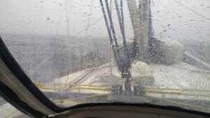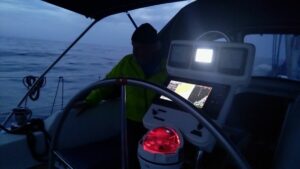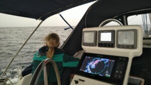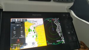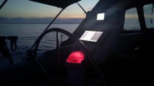 Ich hatte das Radar eingeschaltet und konnte den Bildschirm meines Raymarine Kartenplotter per WLAN auf das Tablett spiegeln. Damit sah ich von innen auch alles so wie draußen. Zusätzlich stellte ich den Wecker auf einen 30Minuten Rhythmus und fuhr in die Nacht.