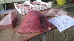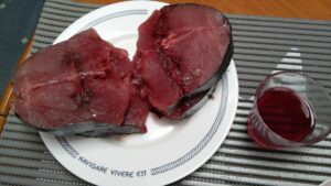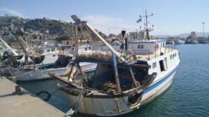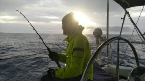 Tags darauf schienen die Bedingungen besser und wir setzten unseren Törn fort. Das Ziel war Reccio Calabria in der Straße von Messina mit der Marina QUEEN88 (60€/N). Es gab Bewölkung und praktisch keinen Wind allerdings noch etwas Wellen von Süden. Fritz holte die Angel hervor und eine Stunde später kam der erste Biss. Ein mächtiger Thunfisch hing am Haken. Fritz drillte ihn in einer Stunde bis zum Boot, dann entkam er – Haken verbogen. Ich war richtig froh, denn dieses 1m Ding wäre sowieso zu groß für uns gewesen. Kurze Zeit später schleppten wir einen neuen Köder nach. Nach einer Stunde kam der nächste Biss. Diesmal ein handlicheres Exemplar von einem Thunfisch. Wir holten ihn gemeinsam raus, ich betäubte ihn mit griechischem Schnaps und Fritz erledigte den Rest.