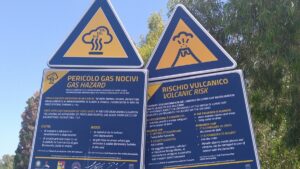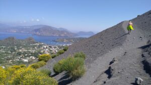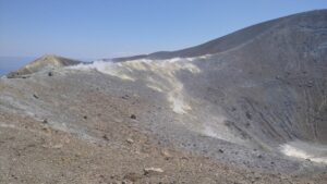 Man könnte es hier noch länger aushalten, aber nach zwei Nächten setzten wir unseren Weg fort und fuhren die vier Meilen rüber nach Vulcano, wo wir in der westlichen Bucht (Ponente) vor Anker gingen. Gleich danach starteten wir zu unserer Vulkanbesteigung und hatten nach 1h15` den Gipfel erreicht. Eine sehr kurzweilige Wanderung mit einem ausgetretenen Pfad, wo ab dem Kraterrand die Schwefeldämpfe zu riechen (und auch zu sehen) sind. So direkt hatte ich einen Vulcan noch nie gesehen und war beeindruckt. Beim Abstieg rutschte Fritz leider bei einer steileren sandigen Stelle aus und kam zu Sturz, was ein paar lästige Abschürfungen zu Folge hatte. Zum Glück ist nicht mehr passiert – schnell kanns gehen. Unten in der Ortschaft gäbe es noch so ein Vulkanschlammloch zum „Baden“, doch das hatte leider geschlossen. Ansonsten hatten wir bald alles gesehen und begaben uns zurück zum Schiff. Wassertemperatur 18 Grad – sehr erfrischend. Am Abend gabs nochmal Thuna-Steaks, welche wir genussvoll beim Sonnenuntergang verspeisten.