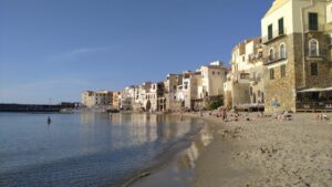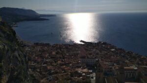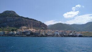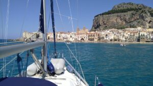 Die Nacht war trotz der Gesellschaft von 20 weiteren Schiffen sehr ruhig. Unsere kommende Etappe hatte 50NM, weshalb wir im Morgengrauen starteten. Leider ab es den prognostizierten Rückenwind nicht in der erforderlichen Stärke, weshalb wir die neun Stunden bis Cefalu nur 1h segeln konnten. Cefalu ist einer der malerischsten Orte an der Nordküste von Sizilien, wo wir 200m vor dem Strand halbwegs geschützt ankerten. Es hatte nun bereits auf über 20Kn aufgebriest, doch der Anker hielt sehr gut und wir begaben uns mit dem Dinghi zum Ufer um die Ortschaft zu erkunden.
