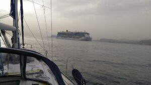 In der Zwischenzeit hatte es bereits immer wieder zu regnen begonnen und es war kalt. Das änderte sich auch über die Nacht nicht. Wir tankten am Morgen noch bei den gegenüber liegenden Zapfsäulen, wo der Betreiber kurz nach einem Telefonanruf (Tel 0039 3471660959) erschien. Dann gings die Straße von Messina weiter nordwärts – diesiges Wetter, immer wieder Regen, teilweise Nebel, kein Wind und die Strömung mit uns. Es hätte noch schlechter kommen können, wir trugen es mit Fassung. Bei der Ausfahrt im Norden kam dann der Wind und wir konnten Richtung Milazzo (Westen) noch etwas segeln.