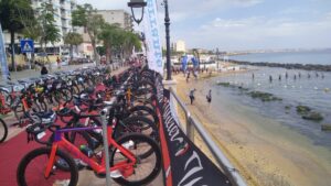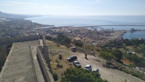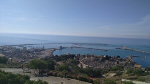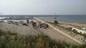 Von der Marina führte ein 2,5km langer Promenadenweg in die Stadt, daneben ein sehr schöner Sandstrand. Die Temperaturen luden allerdings nicht zu einem Bad ein und zusätzlich rauschten die Wellen herein. An diesem Tag wäre eine Weiterfahrt sehr mühsam gewesen, denn es gab stärkeren Wind von Süden. An unserem Rasttag wanderten wir in der Stadt hinauf zum Burgturm, begutachteten alles von oben, tranken in unserem Stammcafe am Hauptplatz Cappuccino (je 1,5€!) und brachten insgesamt einige Km an Fußmarsch zusammen.