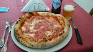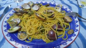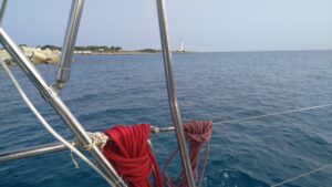 Wir starteten im Morgengrauen bei stark bewölktem Himmel und angenehmen Segelwind. In der Nähe zog ein Gewitter vorbei, welches aber anscheinend eine Runde drehte, denn plötzlich waren wir mitten drinnen. Zum Glück aber eher harmlos und keine Starkwindböen. Zwei Stunden später scheinte die Sonne und wir fuhren bei guten Bedingungen nach Westen zum Stiefelabsatz. Gegen 16.00 Uhr trafen wir im Hafen von Santa Maria di Leuca ein und gingen gleich nach der Hafeneinfahrt als erster Segler rechts längsseits. Bis zum Abend kamen noch ein paar dazu. Die Hafenpolizei muss dort nicht kontaktiert werden. Eigentlich wollten wir in dieser Ortschaft ein paar Lebensmittel einkaufen, doch es hatte alles geschlossen. Erst als wir zum Abendessen gingen fanden wir einen kleinen offenen Lebensmittelladen. Ein Geschäft welches alle italienischen Klischees erfüllte – ein sehr guter Einstieg um das echte Italien kennen zu lernen.