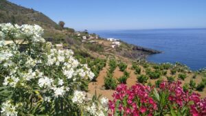 Mein erstes Ziel war ein kleiner türkiser See, ein malerischer Fotostopp. Dann gings weiter ins Landesinnere, wo ich einen Wanderweg ausgewählt hatte, welcher auf den höchsten Gipfel führt. Eine landschaftlich wirklich schöne Insel. Mit etwas Fantasie konnte man die ehemaligen Lavaströme erkennen. Es gab viele Weingärten und immer wieder gepflegte Häuser mit blühenden Gewächsen rundherum.