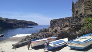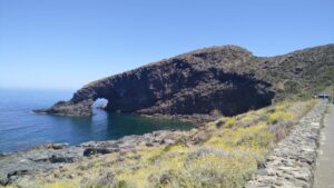 Am nächsten Morgen wartete ich noch so lange bis die Sonnenstrahlen wärmten und startete dann meine Inselerkundung. Pantelleria ist vulkanischen Ursprungs, hat ca 83km² und 7600 Einwohner. Der Hauptort befindet sich zwischen dem erhöht liegenden Flughafen und dem Hafen. Ende Mai gab es noch kaum Tourismus, alles sah irgendwie sehr normal und unspektakulär aus. Sobald man sich jedoch auf der Küstenstraße befand, wurde es interessant. Überall dunkler Vulkanfels, bzw. Steine, dazwischen diverses Grün mit Kakteen und tolle Ausblicke zum strahlend blauen Meer. Fast alle Häuser sind aus dunklem Vulkangestein und haben ein spezielles helles, betoniertes Flachdach, wo das Regenwasser gesammelt wird.