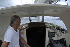 Nach drei Stunden schien es besser zu werden, also nochmal Richtung Westen. Bin nach dem Kap noch eine halbe Meile weiter, dann drehten wir um. Solche Wellen hatte ich bis dato noch nicht erlebt. Es war ungefähr so, wie es die Ozeanüberquerer schildern (zumindest ist es mir so vorgekommen) Die Golden Lady tanzte auf und ab zwischen weißen Schaumkronen und beängstigenden Wellenbergen –Tälern. Obwohl wir mit unserem Verdeck super geschützt sind war es kein Vergnügen… Also retour und ab in die nächste Bucht, wo es in der Zwischenzeit nur mehr kleine Windböen gab.