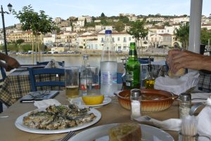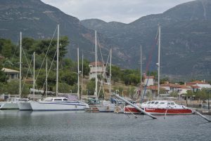 Der nächste Morgen war windstill und ideal zum Ablegen. Eine wunderschöne Fahrt entlang der Peloponnes-Ostküste Richtung Norden folgte. Bei der sehenswerten Bucht Kyparissi bogen wir nach rechts (Osten) ab und motorsegelten über den Argolischen Golf bis zur Inseln von Spetses. Als wir hier südlich vorbei fuhren, und unser Ziel Ermioni nur mehr ein paar Meilen entfernt war begann es plötzlich und wie aus dem Nichts, sehr stark zu blasen. Innerhalb kürzester Zeit bildeten sich kurze Wellen von 1 Meter, welche unangenehm an unsere Seite prallten und Meeresgischt versprühten. Fock einholen war noch machbar, aber das Großsegel ließ ich weit aufgefiert stehen und holte es erst ein, als wir in der Abdeckung von Dokos ein ruhigeres Wellenbild hatten. Den nächsten Adrenalinschub hatte ich eine Stunde später im Hafen von Ermioni – Anlegen bei 5-6 Beaufort. Alles gut gegangen, super Liegeplatz und Entspannung… Danach noch einiges an Hafenkino, gut Abendessen und ab in die Kojen.