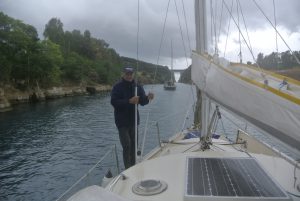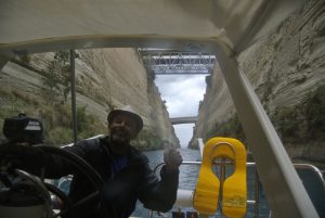 Es hat sich ein Tiefdruckgebiet über uns gebildet. Der gesamte Peloponnes bis hin nach Athen liegt unter Wolken mit teilweise starken Winden und Regen. Um halb sechs piepste meine Uhr – Zeit zum Wetter schauen. Wetterseiten rauf und runter, ein Blick nach draußen und ein ratloses Gesicht meinerseits. Zur Entscheidungsfindung musste wieder mal eine Laufrunde her. Bis zum „Nordkap“ von Aegina und in einem Bogen retour. Wellen gab es schon, aber der Wind lag noch im Erträglichen. Also auf Richtung Kanal von Korinth. Wir waren das einzige ausfahrende Boot – mit Motor und dem kleinen Selbstwendefock ganz hart am Wind Richtung 300 Grad NW. Mit 3-4 Knoten gings schön langsam gegen die Wellen, Wind 4-6 Beaufort. Im Bereich der kleinen Dhiaporio Inseln konnten wir einige Delphine beobachten, ansonsten sahen wir insgesamt zwei weitere Segler bei den 22 Seemeilen bis zum Tower der Kanaleinfahrt. Dort ging alles ganz schnell. Wir bezahlten 111€ und waren 10 Minuten später zu dritt im Kanal Richtung Westen unterwegs. Leider fing es genau in diesem Moment zum Regnen an – also keine Sonne, kein türkisblaues Wasser, aber trotzdem wieder ein beeindruckendes Erlebnis. Für mich war es bereits meine dritte Kanaldurchfahrt.