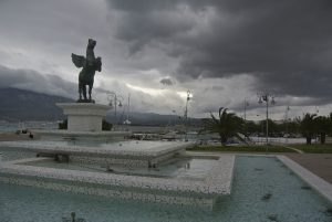 Auf der Westseite bei mittleren Wellen die kurze Strecke zum Hafen von Korinth, wo wir an einem Schwimmsteg seitlich anlegen konnten. Eigentlich ein super Platz, doch in der nächsten Stunde begann es so richtig zu wehen, sodass auch hier im Hafen ein beachtlicher Schwell entstand. Wir lagen aber genau richtig, denn der Wind drückte uns vom Steg weg. Die Wellen brachen sich an der Kaimauer und die Gischt spritzte bis weit auf die Uferpromenade – ziemlich ungemütlich die ganze Geschichte… Zwischendurch wurde es etwas besser und wir begaben uns zur Nahrungsaufnahme in die Stadt. Bei Einbruch der Dämmerung ging das ganze Spektakel wieder los und steigerte sich auf 7-8!