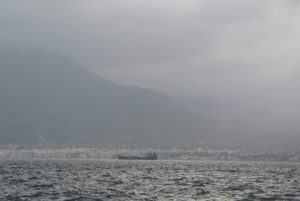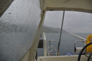 Bis 5 Uhr morgens schaukelte das Boot hin und her, danach war Ruhe. Die Wolken hingen tief, leichter Regen, aber kaum Wind. Da die Wettervorhersagen in den letzten Tagen eigentlich nie so ganz gepasst haben, ignorierte ich die stärker prognostizierten Winde im Bereich Korinth und konzentrierte mich eher auf die besseren Verhältnisse Richtung Westen. Also raus und weiter. Leider eine Fehleinschätzung, denn ab dem Kap Melanga VI (NNW von Korinth) waren Wind und Wellen grenzwertig, sodass wir uns in eine nahe Bucht zurückzogen. Auch hier kamen die Böen mit gemessenen 7-8 Beaufort.