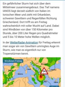 Conny zog vorübergehend bei mir in der Backbordkajüte ein, denn es war kein Ende absehbar und er wollte vor Ort sein. Zuerst kam der Wind von Südost und nach ein paar Stunden wechselte die Richtung schön langsam auf Nordost/Nord. Dieser Medicane Namens „Ianos“ zog mit dem Zentrum im Bereich zwischen Zakynthos – Kafalonia/Ithaka (angeblich Windgeschwindigkeiten bis 100Kn, sowie Starkregen) durch und hinterließ eine Spur der Verwüstung. In der nahen Vliho Bay wurden Böen bis 60Kn gemessen, wieviel es bei uns war kann ich nicht genau sagen, jedenfalls genug um manchmal Gänsehaut zu bekommen. Wir sahen ständig auf Handy und Tablett um die neuesten Wetterprognosen zu begutachten. Dieser rot-violett eingefärbte Tiefdruckwirbel hatte etwas Gruseliges und immer wieder war die Angst, dass er doch noch genau zu uns kommt.