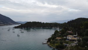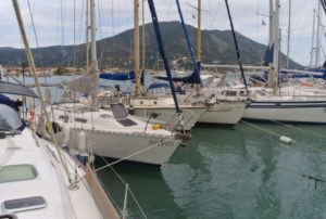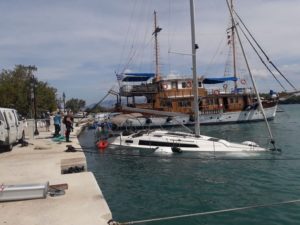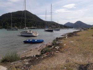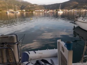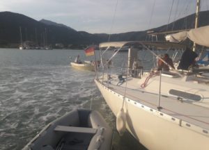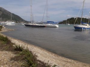 Gegen Mittag fuhren wir mit dem Beiboot von Thorsten zu dritt rüber nach Nidri um den Proviant aufzufüllen. Doch auch in Nidri waren die vergangenen Sturmtage nicht spurlos vorüber gegangen. Der starke Wind hatte das Wasser so an Land gedrückt, dass die Wellen den Uferschotter über den Gehsteig bis zur Straße geschwemmt hatten. Eine Segelyacht war am Stadtkai von Nidri gesunken und ein paar andere Schiffe steckten ungewollt im Uferschlamm fest. Nidri hatte den Nordostschwell voll abbekommen. Beim Skorpios Ponton war trotzdem alles in Ordnung. Hier hat man schon Erfahrung mit Wellen aus dieser Richtung.