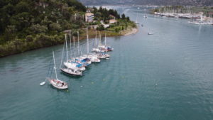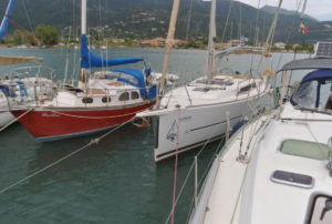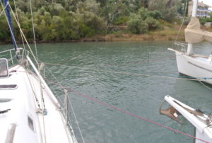 Es handelt sich dabei um Liegeplätze ohne Landberührung im Uferbereich, wo Mooringleinen für ca 20 Schiffe parallel am schlammigen Grund (sehr große Anker mit dicke Ketten untereinander verbunden) befestigt sind. Die Schiffe werden schwungvoll mit dem Bug in Richtung Ufer gefahren, bis sie am Kiel vom Schlick abgebremst werden, bzw. im Schlamm stecken. Dann werden Bug sowie Heck mit den Mooringleinen festgezurrt, die Schiffseiten gut abgefendert und die Schiffe untereinander auch noch teilweise seitlich verbunden. Insgesamt bildeten nun ca 13 Schiffe zwischen 30 und 45 Fuß einen Verbund, der in sich noch etwas beweglich war. Der gesamte Bereich war lediglich nach NNW ca ½ Meile Richtung Nidri offen, ansonsten sehr gut geschützt. Größere Wellen von außerhalb des Buchtbereiches waren hier nicht zu erwarten.