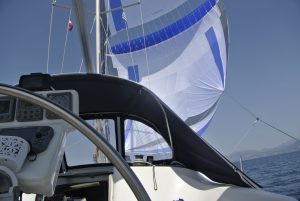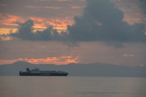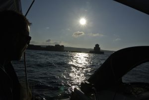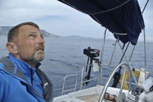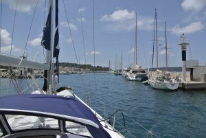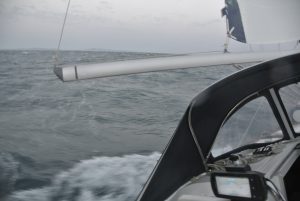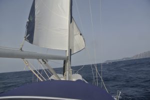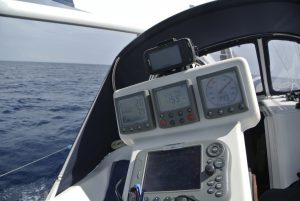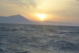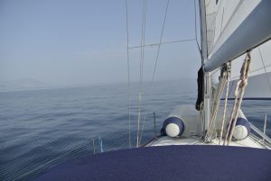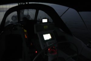 Da nicht an Tiefschlaf zu denken war, starteten wir um 04.30 Uhr den Motor und fuhren im Schein des Hafenlichtes in den Golf von Patras. Bereits nach ein paar Minuten spürten wir Wind und ich setzte etwa die Hälfte des Großsegels. Diese Vorsichtsmaßnahme war goldrichtig, denn wieder ein paar Minuten später blies es immer mehr. Plötzlich gab es schon 25 Kn Wind ….und kein Ende in Sicht. Die Dunkelheit hatte uns bereits vollständig erfasst und im Schein der Stirnlampe rollte ich das Großsegel bis kurz nach dem 1. Reff ein. Eigentlich ein sehr kleines Stück Segeltuch…., aber ausreichend für die nächsten 30 NM Richtung Westen. In weiterer Folge steigerte sich der Wind in Böen bis 45 Knoten (= bis 9 Beaufort = Sturm) und Calisto erreichte Geschwindigkeiten bis 10 Knoten! Es war eine rauschende Fahrt, die uns etwas gemächlicher fast lieber gewesen wäre… Auf alle Fälle eine sehr wichtige Erfahrung mit großem Lerneffekt für mich.