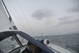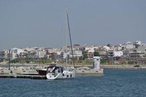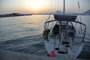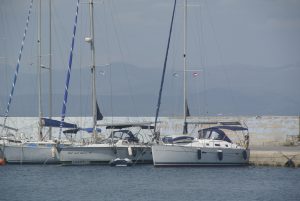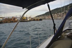 Der Weg dorthin war bis zum Kap Tainaron ganz angenehm, leichte Welle und kein Starkwind. Als wir ums Kap bogen kamen dann giftige Fallwindböen die uns eine Weile beschäftigten. Zum Glück hatte ich vorher bereits die Genua eingerollt. Es reichte aber trotzdem, dass wir einmal eine gewaltige Schräglage erhielten, die uns wahrscheinlich eine Sitzunterlage geholt hat. Jedenfalls war diese am Abend nicht mehr da. Es begann dann auch noch leicht zu regnen, wurde aber immer besser, je näher wir zu Gytheon kamen. In der Abenddämmerung erreichten wir nach 85 NM diese sehr nette griechische Kleinstadt.