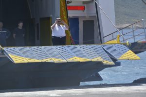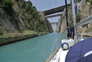 Die Nacht war ruhig und der Aufbruch wieder ziemlich zeitig. Ich wollte jetzt endlich mal meinen neuen PARASAILOR testen und auf der Fahrt zum Kanal von Korinth ergab sich diese Möglichkeit. Die Bedingungen waren ideal, keine Welle und 5-6 Kn Wind. Also raus mit diesem Ding. Zuerst mussten die benötigten Seile, Blöcke und Befestigungen hergerichtet werden und dann kam der spannende Augenblick. …der Easysnuffer (Bergeschlauch) wurde hochgezogen und ganz sanft entfaltete sich dieses weiß-blaue riesige Segel. Obwohl Fritz das Segeln ziemlich egal ist, entglitt ihm auch ein andächtiges „Wow…“. Leider dauerte das Vergnügen nur ein paar Meilen, denn der Wind wurde immer weniger und irgendwann geht’s dann nicht mehr. Vor dem Isthmus (Osteinfahrt Kanal v. Korinth) briste es wieder auf und wir durften bei 15 Kn Ost anlegen. Die Kanalformalitäten waren schnell erledigt (140€ Gebühr), doch diesmal (es ist bereits meine 4. Kanaldurchfahrt) mussten wir über eine Stunde warten. Der Grund war ein ziemlich großer Frachter, welcher von einem Schleppkahn von West nach Ost gezogen wurde. Die anschließende Durchfahrt war wieder geprägt von großer Ehrfurcht und Staunen, jedoch ohne besondere Vorkommnisse. Durch das viele Fotografieren muss ich aber immer aufpassen, dass ich nicht wo ankrache…