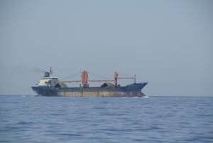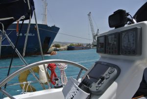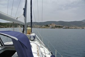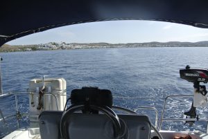 Die See war zum Glück ruhig und so war es halbwegs angenehm. Trotzdem schlief ich auf „stand by“. Als ich gegen 4 Uhr früh bemerkte, dass der Wind etwas mehr geworden ist, begab ich mich mit meinem Schlafsack aufs Deck und döste dort weiter. Plötzlich kam ein kleineres Schiff in Sicht, welches mit einem starken Scheinwerfer die Gegend ableuchtete. Im Fernglas sah ich, dass es sich vermutlich um ein Polizeiboot handelt. Dies bestätigte sich und ein paar Minuten später war die CALISTO bereits im grellen Licht. Das Boot kam näher, am Bug dieses typischen „Portpolice-Schiffes“ stand eine männliche Person in Uniform und befragte mich über „woher – wohin?“ etc. Letztendlich musste ich meine Dokumente in einen herübergereichten Kescher geben, und unsere Daten wurden überprüft. Das Ganze im Licht des starken Scheinwerfers in Gesellschaft tausender Fliegen, Falter, Moskitos, etc…. Nach einer halben Stunde war die Aufregung vorbei und das Schiff zog mit Mann und Getier weiter. An Schlaf war jetzt nicht mehr zu denken, weshalb wir den Motor starteten und langsam Richtung Pylos fuhren.