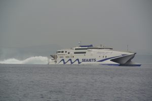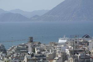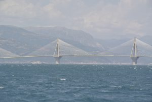Als nächstes Etappenziel wäre nach diesem Rasttag die Marina von Patras ausgewählt gewesen. Leider erhielt ich die Info, dass dieser Yachthafen aufgrund von Beschädigungen durch Winterstürme derzeit repariert wird und deshalb geschlossen ist… Die Fahrt nach Patras war jedenfalls geprägt vom Ostwind, der sich von ganz leicht auf 20 Kn steigerte. Dies ergab abermals die Gelegenheit den Parasailor zu setzen. Wir hatten dieses geile Ding bis 15Kn Wind in Verwendung und erreichten Geschwindigkeiten bis knapp 7 Kn. Als es dann Richtung Rion-Brücke ging und die Düsenwirkung immer stärker zu spüren war, zog ich den Bergeschlauch über das Segel. Diesmal musste ich mich zu Beginn schon ganz schön rein hängen um den Easysnuffer nach unten zu ziehen. Es klappte aber vorzüglich und die Sache war relativ schnell erledigt. Danach gings (Funkanmeldung) mit gesetzter Genua unter der Brücke von Patras durch bis zum Hafen. Wir wollten uns wie von der Marinaleitung empfohlen mit Funk Kanal 13 beim Hafenmeister anmelden, doch niemand hörte uns, bzw meldete sich keiner. Im Hafenbecken vor den großen Fährschiffen sahen wir einige Segler an Mooringleinen vor dem Kai hin und her schaukeln. Mangels Alternative entschlossen wir uns dort anzulegen. Der Wind kam natürlich genau von der Seite und wir benötigten drei Anlegemanöver um dort entsprechend zu liegen (fixiert mit drei Mooringleinen). Ohne Hilfe den anwesenden Segelcrews hätten wir das nicht geschafft. Es stand ganz schön Schwell an der Hafenmauer und das Übersetzen von der Gangway aufs Ufer erforderte durch die permanente Wacklerei einiges Geschick. Patras ist uns deshalb nicht so gut in Erinnerung. Auch der Nachmittagsausflug in die Stadt war nicht so besonders. Die Burg am Stadtberg (tolle Aussicht) hatte bereits um 15.00h geschlossen, und unser Gyros/Pita war auch keine Gaumenfreude. Wir arbeiteten unsere Einkaufsliste ab und verzogen uns wieder auf die Calisto. Die Wacklerei nahm die gesamte Nacht kein Ende. Auch als der Wind bereits eingeschlafen war, ging es permanent auf und ab. Der Wetterbericht zeigte auf der „Windy“ App ab 04.00 Uhr Windstärke 4-5, Windfinder 3-4, und die anderen (ich schaue immer 5-6 verschiedene Vorhersagen) zeigten total ruhig.