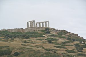 Wir verließen die Insel im kommenden Morgengrauen und fuhren bei absoluter Flaute und teilweise spiegelglattem Wasser (erstmals in der Ferne Delphine gesehen) nach Nordwesten bis zum Kap Sunion (Kap am Festland südlich von Athen), wo der Poseidontempel schon von weitem zu sehen ist.