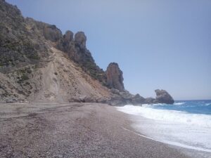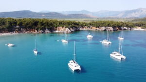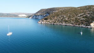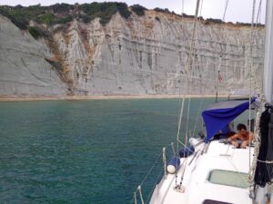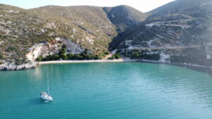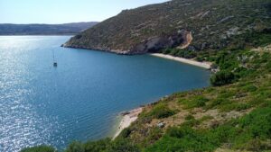 Glasklares Wasser und eine imposante Steilküste mit Sandstrand, sehr sehenswert. Der Sandboden ist jedoch hart, sodass der Anker mit Schwung eingefahren werden muss. Zusätzlich sollte man immer den Grund beachten, denn es gibt auch einige Bereiche mit Steinen und Steinplatten. Am Ufer befindet sich ein Kai, welcher aber für Segler zu seicht ist. Die Taverne auf der malerischen Anhöhe hatte leider wegen Renovierung geschlossen, sodass wir zum Dinner in das benachbarte Hotel ausweichen mussten. Ansonsten gibt es keine Infrastruktur. Spartia ist jedenfalls einen Stopp wert.