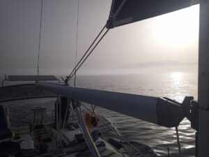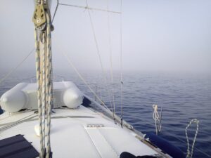 George dirigierte wie eh und je die Boote in den Hafen. Der sonst so quirlige Mann wirkte jedoch etwas niedergeschlagen, denn die heurige Saison erfüllte bis jetzt nicht die Erwartungen. Bis zum Abend befanden sich lediglich 13 Segler am Kai, sehr wenig für diese Zeit. Was mir noch aufgefallen ist – wir schnorchelten beim nahen „Mühlenstrand“ doch das Wasser war trüb. Das hatte ich hier noch nicht erlebt. Genauso wie das diesige Wetter. Alles wirkte etwas anders. Ebenso am kommenden Morgen, wo wir bereits früh Richtung Kefalonia starteten. In der Ferne zeigte sich eine Nebelbank, welche immer näher kam. Auf Höhe von Atakos hätten wir fast ein Radar benötigt. Rundherum dichter Nebel und so hohe Luftfeuchtigkeit, dass vom Biminigestänge das Wasser tropfte. Zwischendurch frischte der Wind auf, legte sich wieder, drehte, wurde wieder stärker und erzeugte auch ungute kurze steile Wellen gegenan. Mühsame Stunden mit wechselnden Bedingungen bis zum Südostkap von Kefalonia, danach war zwar auch noch Gegenwind, doch wir setzten unseren Weg nordwestlich bis zur Bucht Spartia fort.