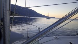 Für den nächsten Tag war eine ruhige Bucht geplant – wir legten bereits kurz nach Mittag im Kalo Limani (Kefalonia Ost) mit Buganker und Landleine an. Alles schien perfekt, doch es folgte eine Wespeninvasion die uns in kürzester Zeit in die Flucht trieb. So massiv hatte ich das bisher noch nirgends erlebt. Zum Ausgleich folgten tolle Segelmeilen nach Norden bis in die Bucht von Vasiliki (Lefkas). Der Nachmittagswind passte ideal und ließ uns mit 6-7 Knoten durchs Wasser rauschen. Wir warfen bei 20-25 Kn NW auf 7m Tiefe den Anker, dazu 40m Kette und wir lagen sicher.