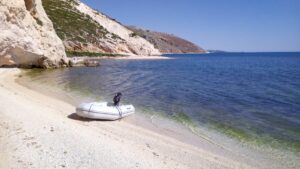 Clemens flog am Abend nach Hause und ich war fortan solo unterwegs. Am nächsten Tag gings im Ormos Livadhi 5 NM nordwärts, wo ich in der nordöstlichsten Bucht „Koumaria Beach“ meinen Anker warf. Total einsam hier, nur ein weiterer Segler, ansonsten Stille und viel sehenswerte Gegend. Weiße Felsen vom Wasser aufragend und davor bilderbuchmäßige kleine weiße Sandstrände. Vom Koumaria Beach führte ein befahrbarer Weg nach oben zu einem Dorf. Es war nun total windstill – ein Hochgenuss vor Anker!