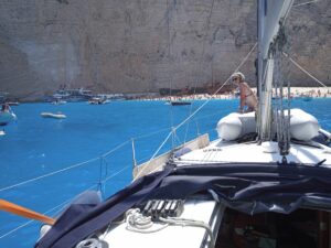 Nach einer ruhigen Nacht folgte der kurze Schlag an die Zakynthos Westseite bis zur Shipwreck Bay. Eine sehr unruhige Fahrt, denn jede Menge Ausflugsschiffe und Motorboote sorgte für einiges an Wellenwirrwarr. In der Navagio Bucht ging natürlich auch die Post ab. Dieser Tourismushotspot sorgte für ein ständiges Kommen und Gehen, garniert mit diversen Schiffshupen und Lautsprecheransagen.