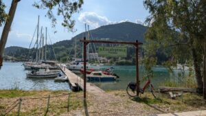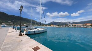 Der Morgen nach dem Abschiedsabend in Nidri gestaltete sich etwas mühsam für mich, es war aber lediglich die Etappe nach Vasiliki vorgesehen. Kurz vor Mittag gings bei passendem Wetter, also schwach windig und Sonne, los. Drei Stunden später konnte ich bereits im Hafen von Vasiliki anlegen. Es gab genügend Platz, bis zum Abend lagen nur vier Segler am Kai. Ein kleiner Buchtspaziergang und typisch griechische Souvlaki zum Abendessen waren die Highlights. Getrübt nur durch einen fünf Minuten Schütter genau beim Essen…., noch dazu hatte ich die Bootsfenster geöffnet ☹