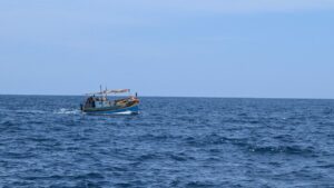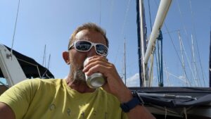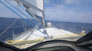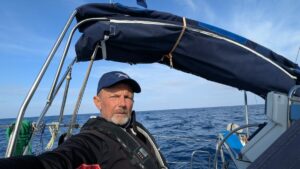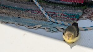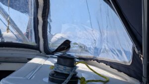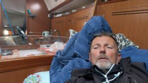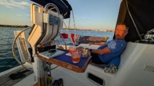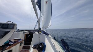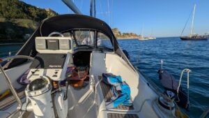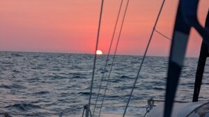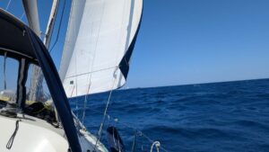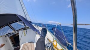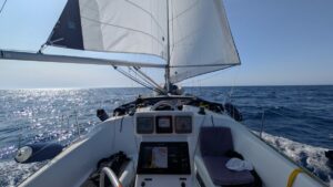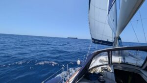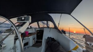 Es dauerte eine Zeit, bis ich mich wieder an alles gewöhnt hatte. Meine technischen Helfer funktionierten, alles gut. Zwischendurch wurde der Wind schwächer, ich baumte die Genua aus und nahm etwas später für ein paar Stunden den Motor dazu. Schön langsam verschwanden die Ionischen Inseln aus meinem Blickfeld und bald war nur mehr rundherum Wasser. Das Internet verabschiedete sich und am Abend ging sich gerade noch ein Telefonat mit meiner Andrea aus. Ich hatte aber mein GARMIN InReach aktiviert und in Verbindung mit der Earth-App auf dem Smartphone war das nun mein Kommunikationsmittel. Zusätzlich wurde mein Track aufgezeichnet und konnte über einen von mir versendeten Link auch von zu Hause mitverfolgt werden, Ein beruhigendes Gefühl. In Verbindung mit dem Kartenplotter, der Selbststeueranlange und dem Radar, sowie AIS, eigentlich alles ganz easy. Während des Tages hatte es angenehme Temperaturen, als Essen gabs aufgewärmten „Spinach Pie“, etwas Obst und div. Snacks. Und Besuch erhielt ich auch, es kamen immer wieder kleine Vögel die auf der Calisto eine Ruhepause einlegten. Sie flogen wie selbstverständlich in die Kajüte, machten dort ein Nickerchen und hatten keinerlei Scheu.
