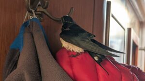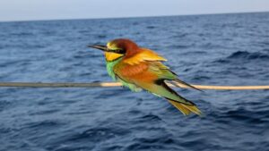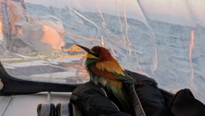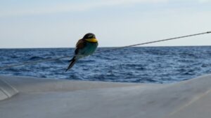 Zwischendurch kamen dann abermals wieder Vögel um auf der Calisto zu stoppen. U.a. ein bunter „Bienenfresser“. Er blieb bis nächsten Morgen bei mir, schlief im Schutz der Sprayhood auf der dortigen Rettungsweste und hatte echt keine Scheu.